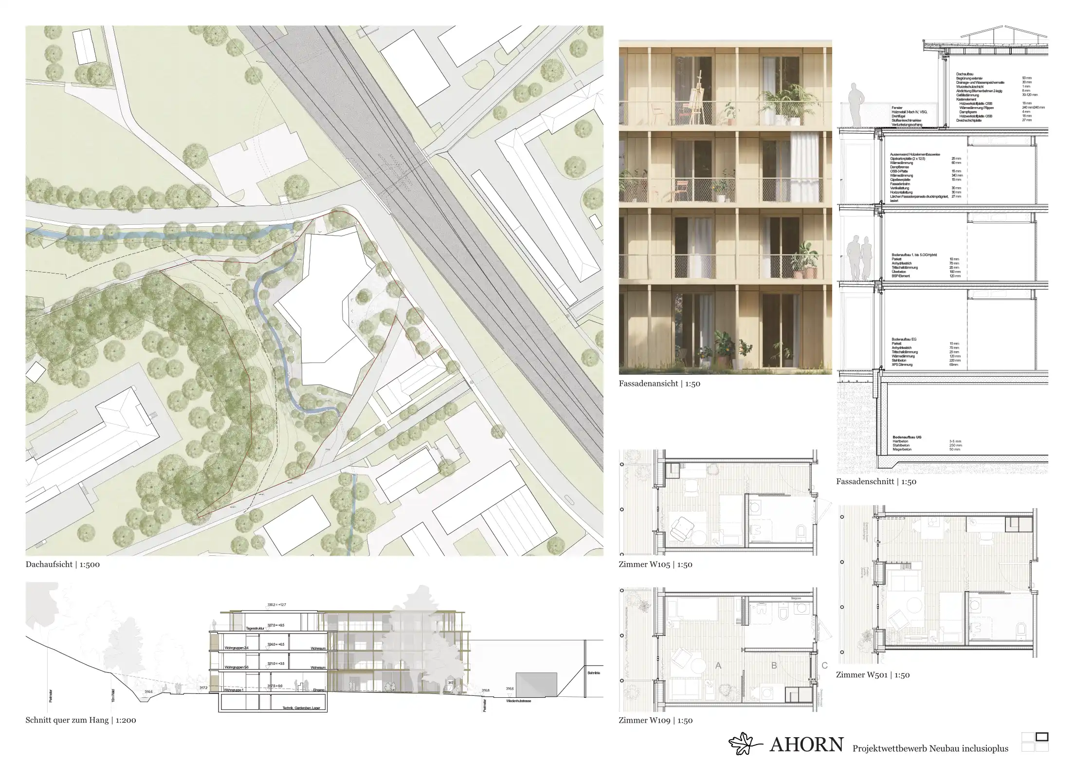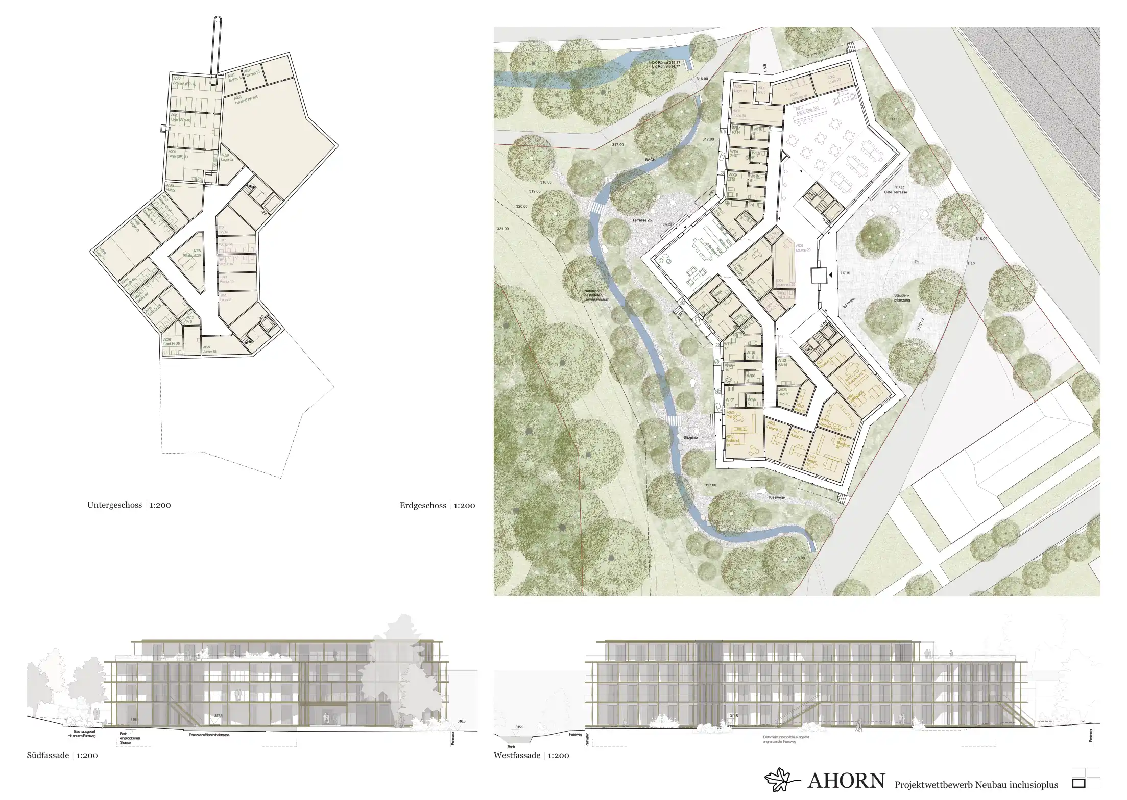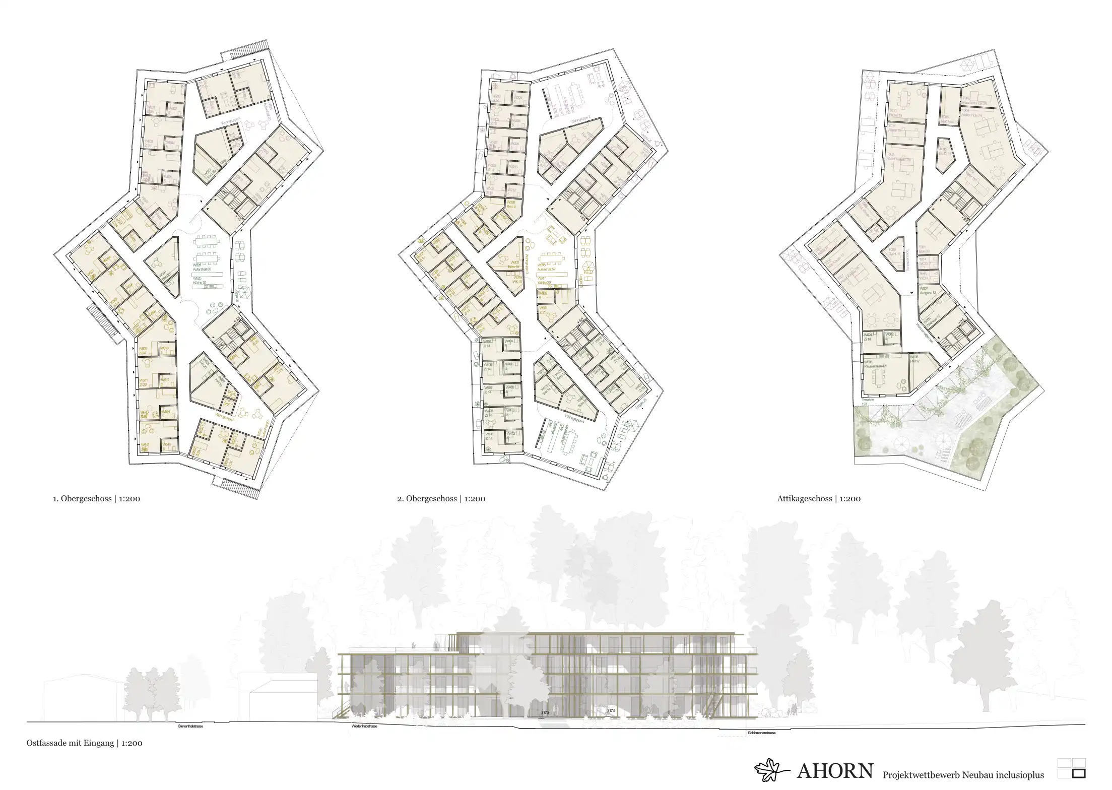 Das Haus mit seinen polygonalen Formen, verbindet sich mit diesem ruhigen Landschaftsraum und die westseitigen Bewohnerzimmer profitieren von dieser Ausrichtung. Auf der Ostseite des Hauses Richtung Bahn liegt der Haupteingang mit der Anlieferung. Der grosszügige Eingangsplatz wird von breiten Grünbereichen und Baumpflanzung eingefasst. Um das Haus herum liegen noch weitere einzelne Aufenthaltsbereich und Sitzplätze, die den verschiedenen Wohngruppen zugeordnet sind.