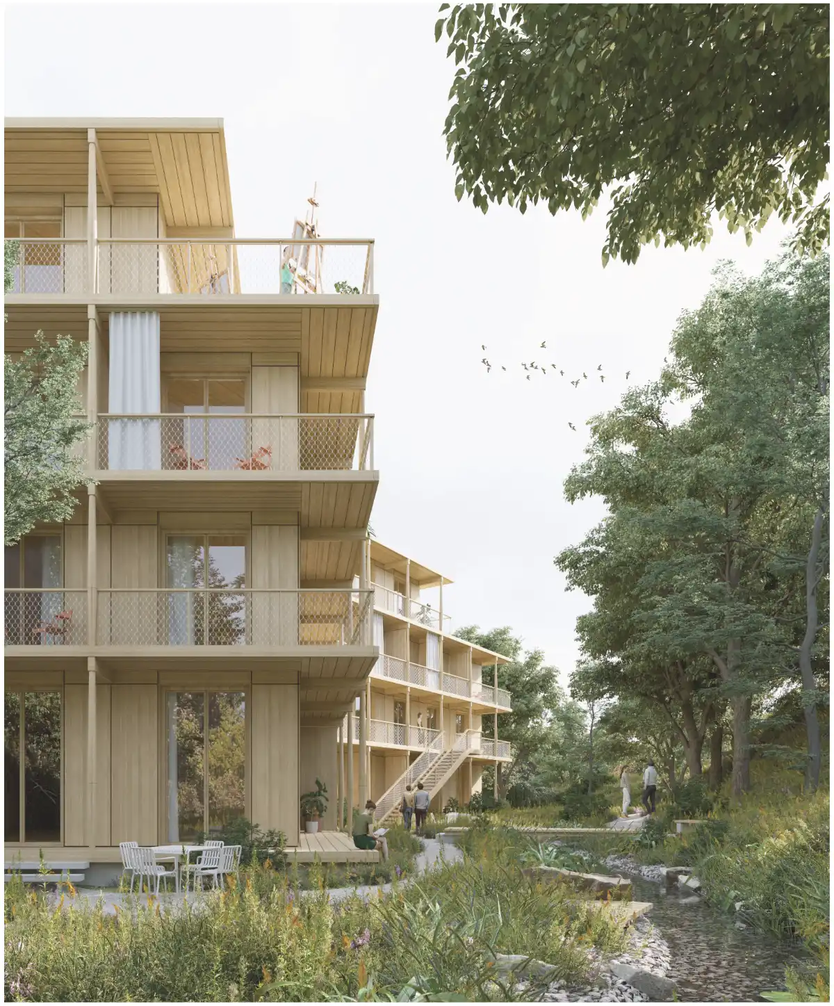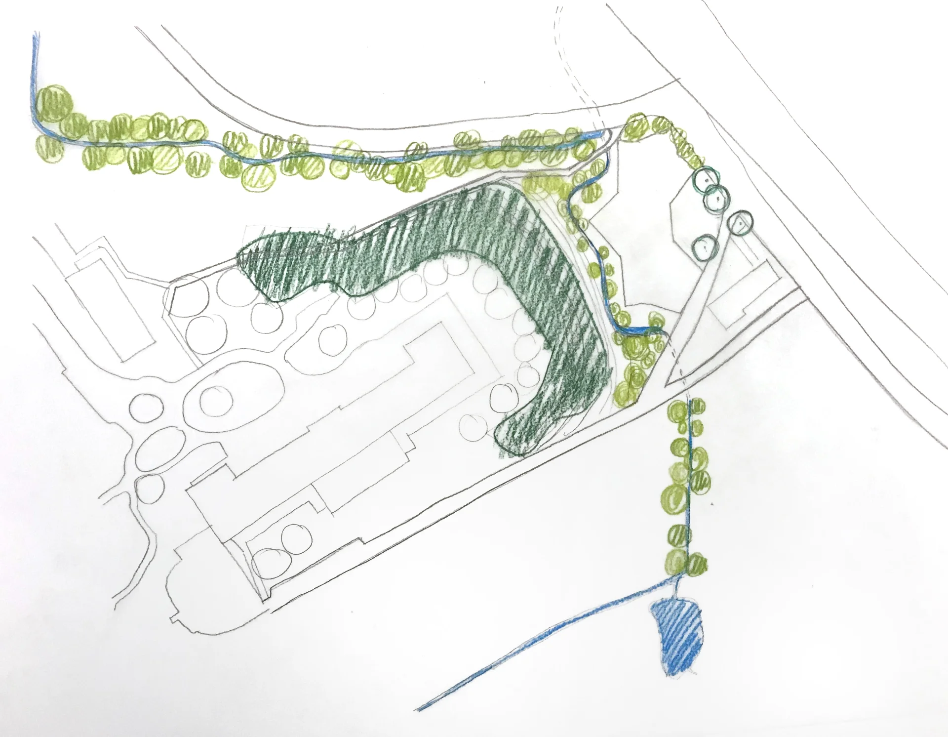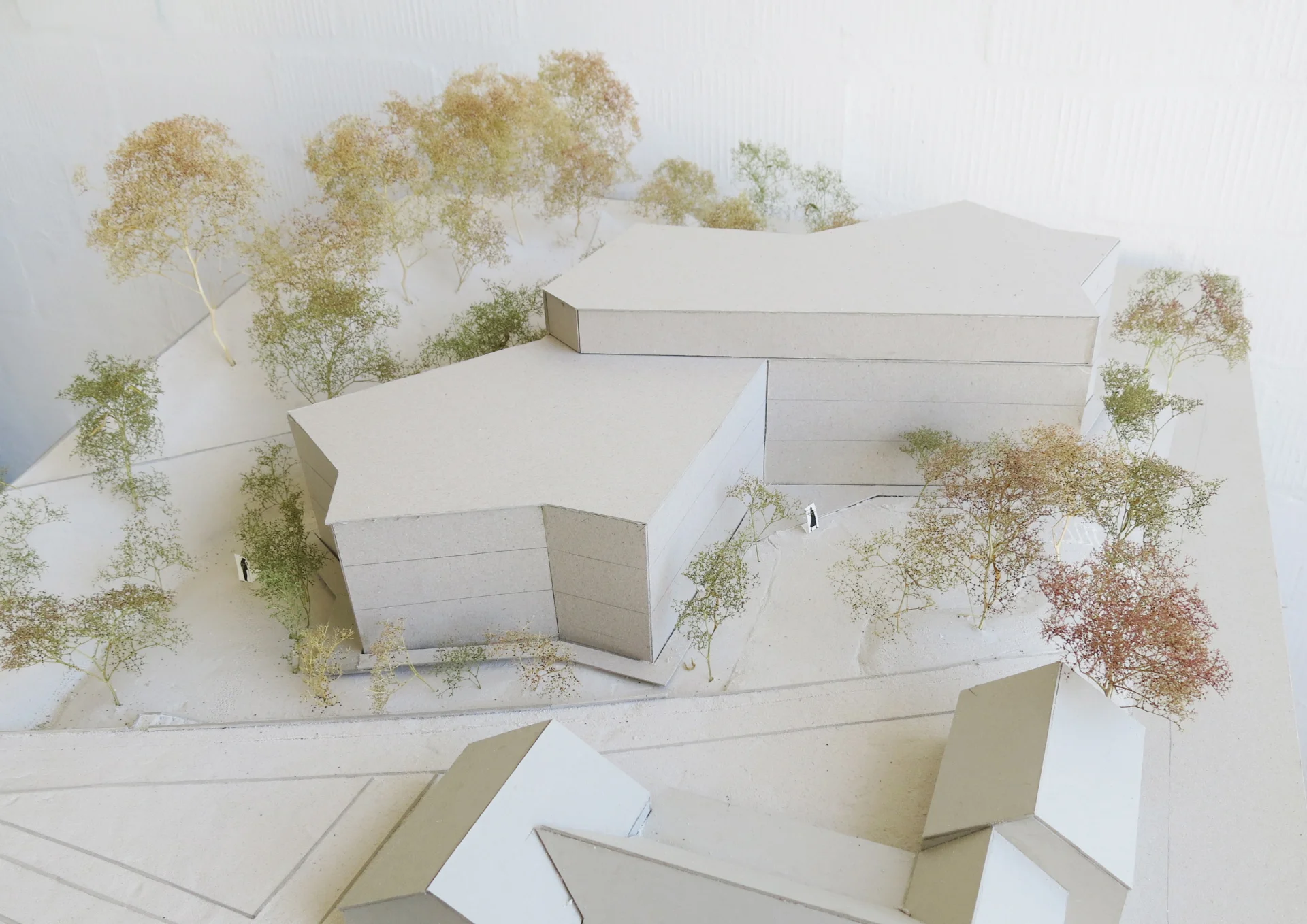 Das Haus mit seinen polygonalen Formen, verbindet sich mit diesem ruhigen Landschaftsraum und die westseitigen Bewohnerzimmer profitieren von dieser Ausrichtung. Auf der Ostseite des Hauses Richtung Bahn liegt der Haupteingang mit der Anlieferung. Der grosszügige Eingangsplatz wird von breiten Grünbereichen und Baumpflanzung eingefasst. Um das Haus herum liegen noch weitere einzelne Aufenthaltsbereich und Sitzplätze, die den verschiedenen Wohngruppen zugeordnet sind.